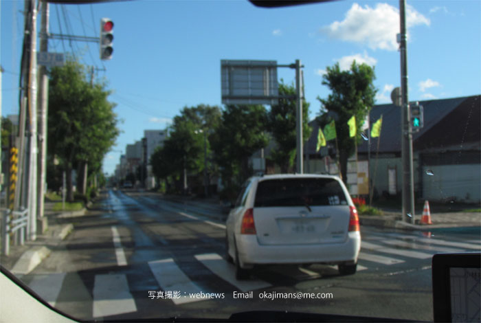 南岸通り、野付牛自動車学校前、奥がとん田通りの交差点