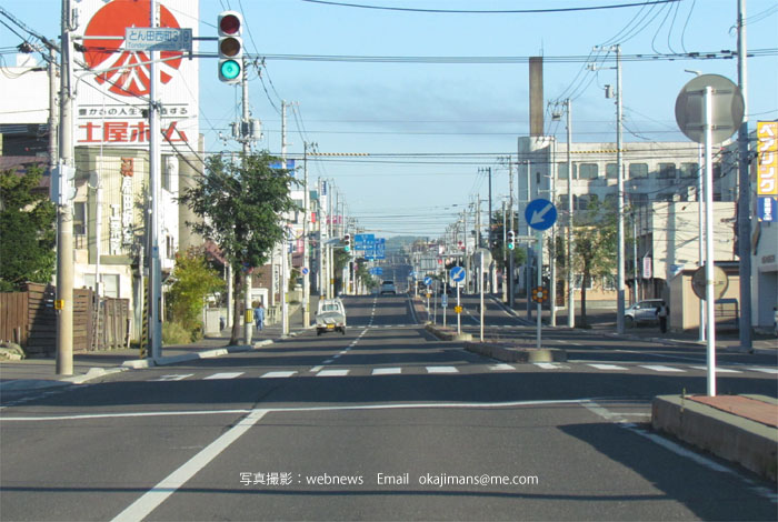 南岸通り、野付牛自動車学校前、奥がとん田通りの交差点
