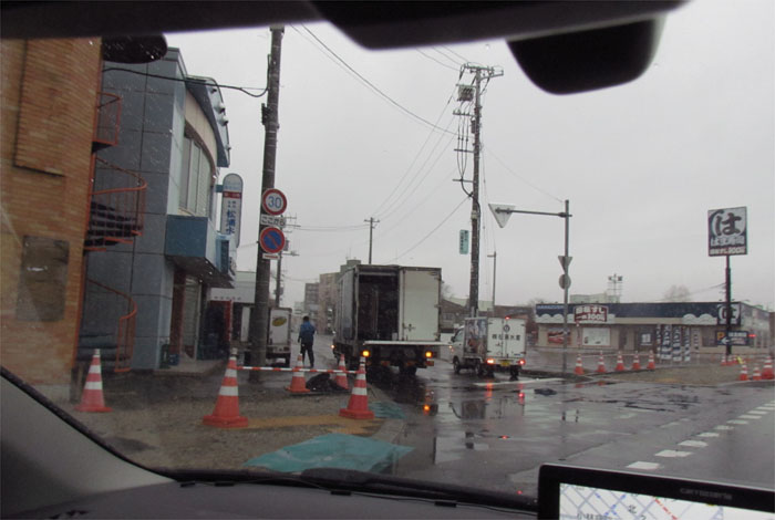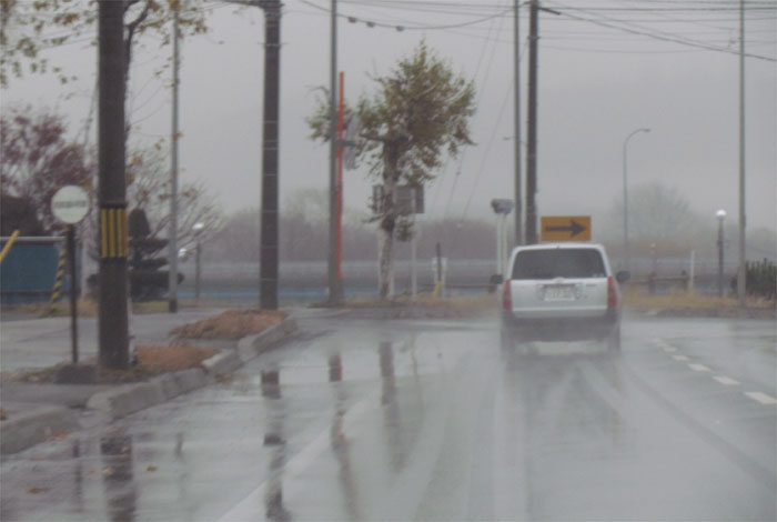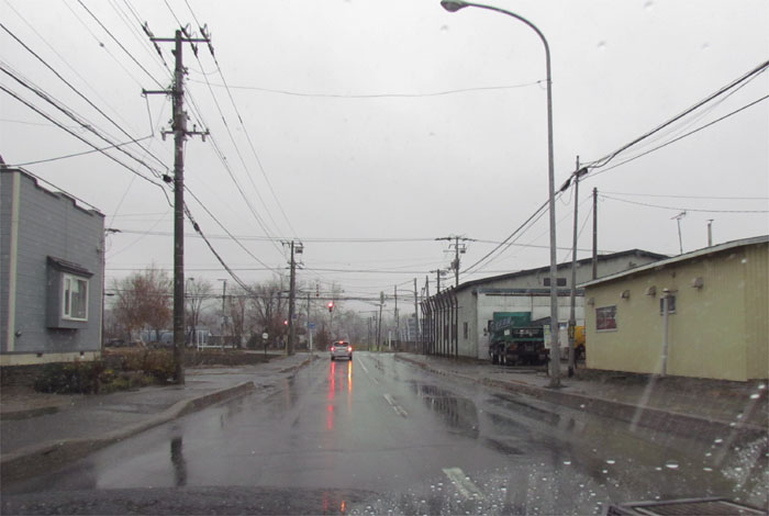 南岸通り、野付牛自動車学校前、奥がとん田通りの交差点