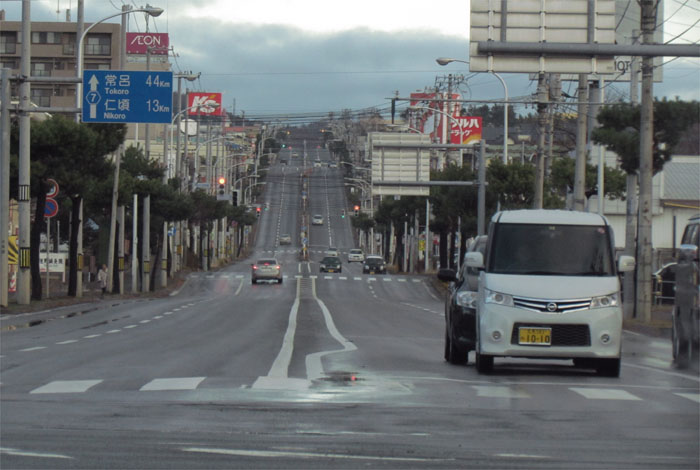 末広町の南岸通り、西4号線バス停前から野付牛自動車学校方向