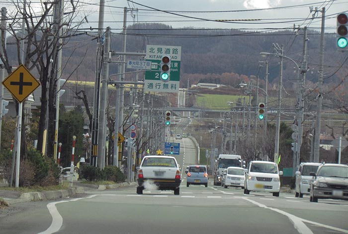 前方がJR石北本線高架橋、写真右が北見駅方向