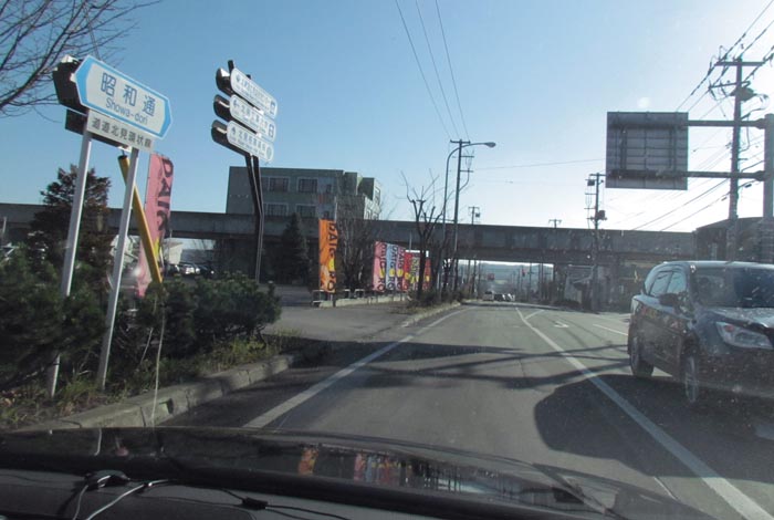 前方がJR石北本線高架橋、写真右が北見駅方向