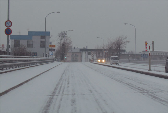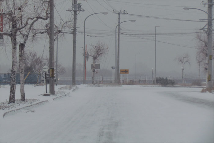 南岸通り、野付牛自動車学校前、奥がとん田通りの交差点