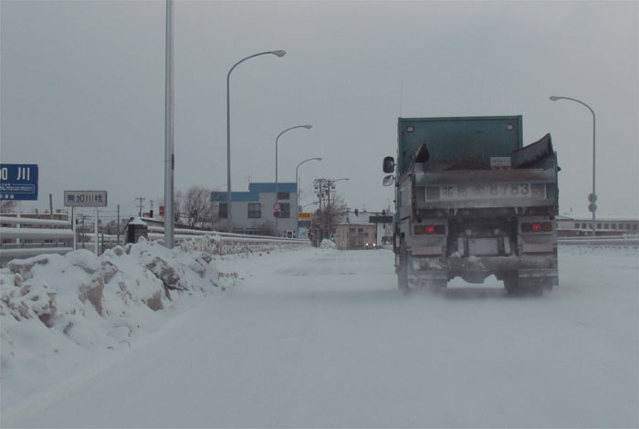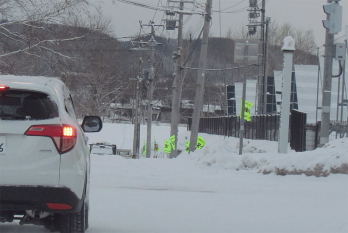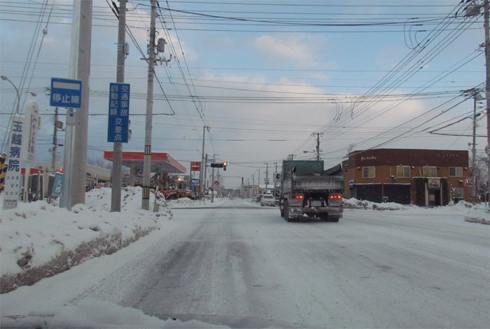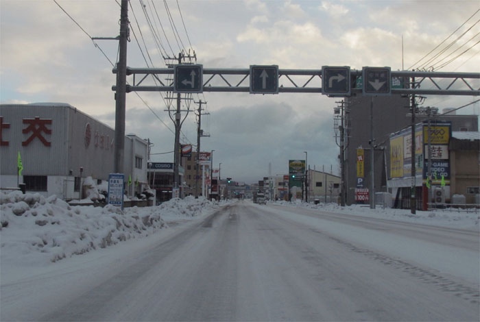 南岸通り、野付牛自動車学校前、奥がとん田通りの交差点