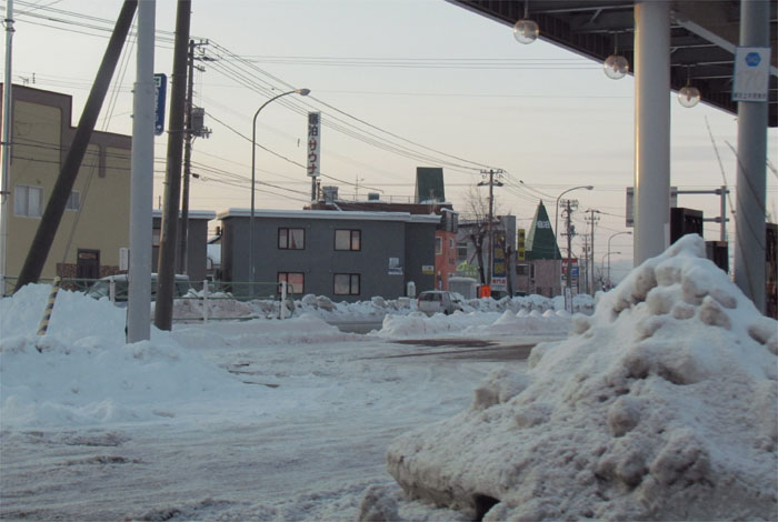 南岸通り、野付牛自動車学校前、奥がとん田通りの交差点