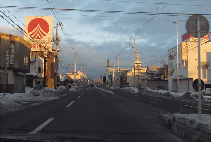 南岸通り、野付牛自動車学校前、奥がとん田通りの交差点