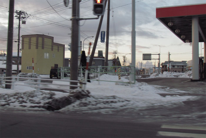 南岸通り、野付牛自動車学校前、奥がとん田通りの交差点