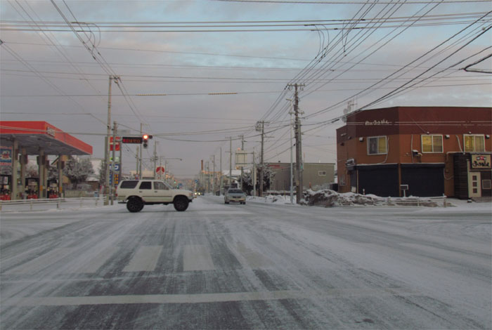 南岸通り、野付牛自動車学校前、奥がとん田通りの交差点