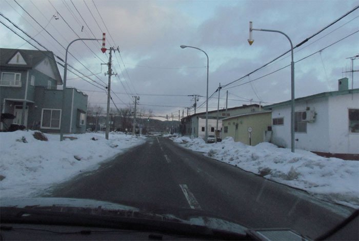 南岸通り、野付牛自動車学校前、奥がとん田通りの交差点