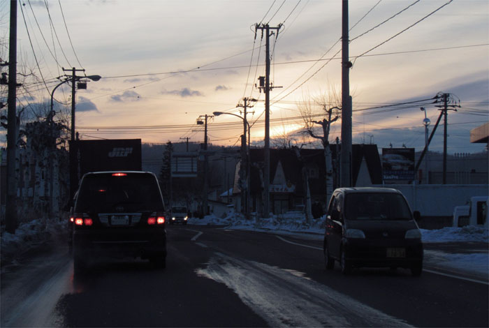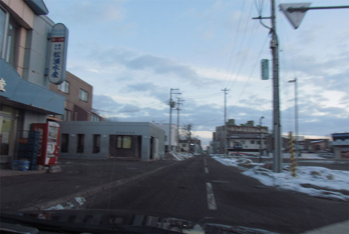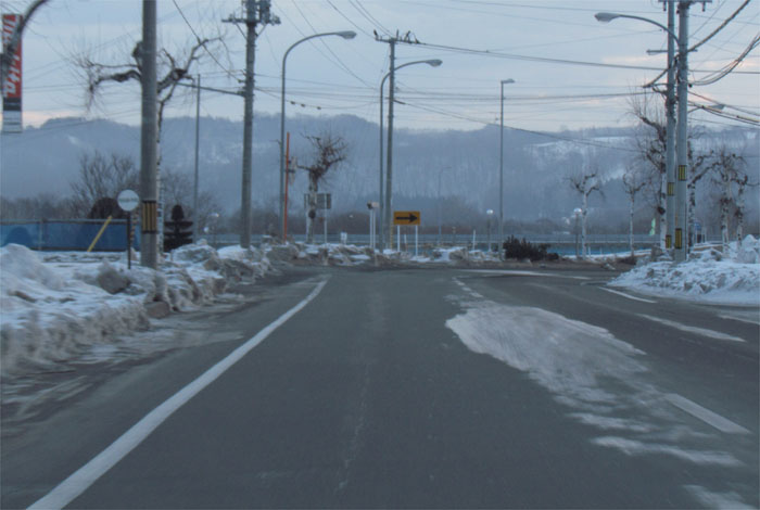 南岸通り、野付牛自動車学校前、奥がとん田通りの交差点