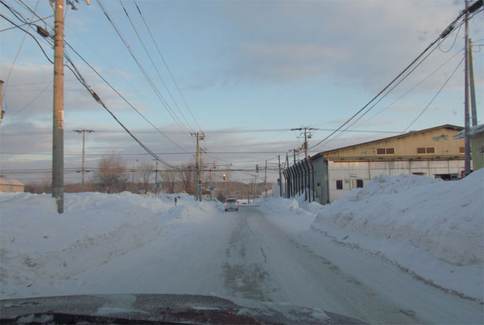 南岸通り、野付牛自動車学校前、奥がとん田通りの交差点
