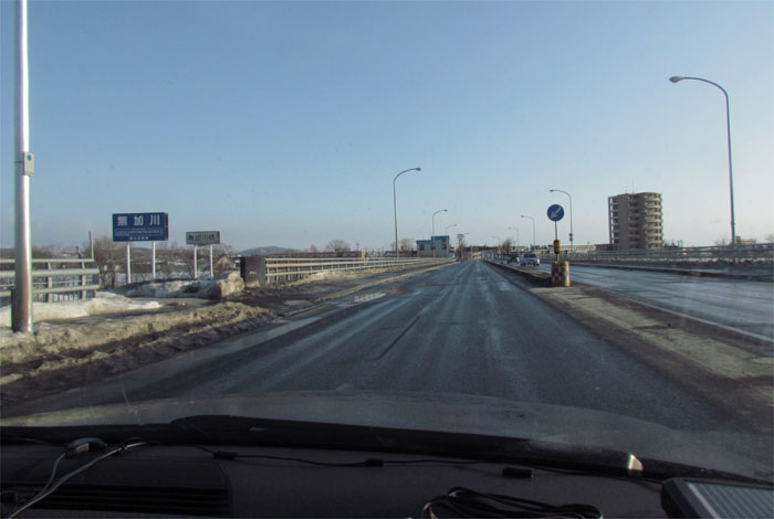 写真中央、堤防の向こうは無加川を挟んで工業技術センター前の西5号線南大通り交差点