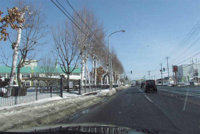 この交差点を左折すると柏陽高校のグラウンド横を通り北見看護大学方向