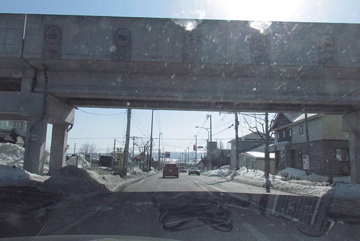 前方がJR石北本線高架橋、写真右が北見駅方向
