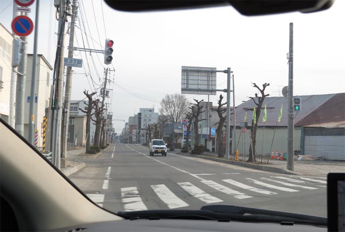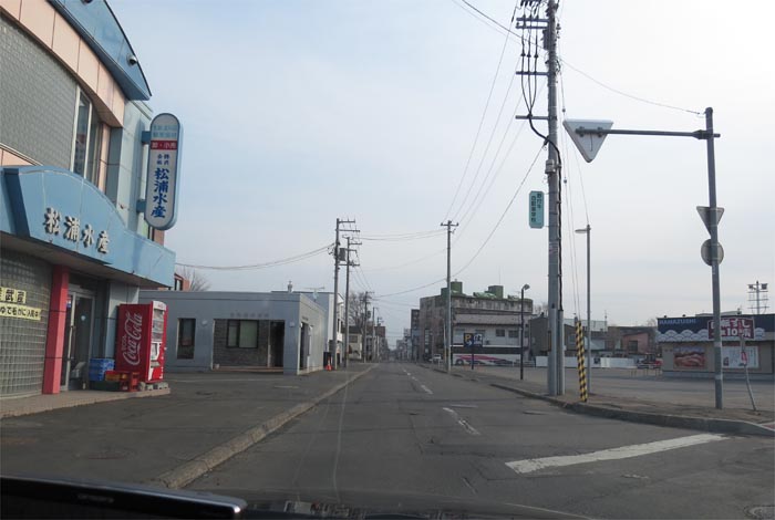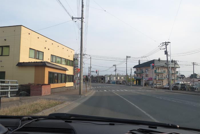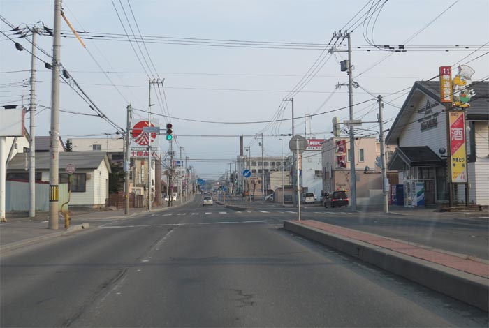 南岸通り、野付牛自動車学校前、奥がとん田通りの交差点