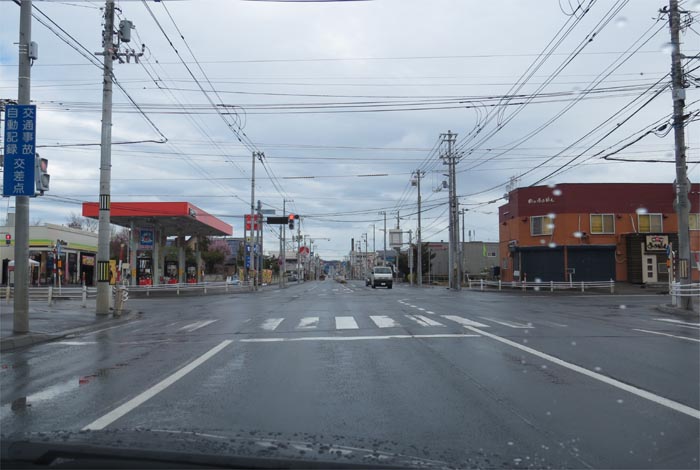 南岸通り、野付牛自動車学校前、奥がとん田通りの交差点