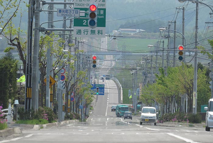 前方がJR石北本線高架橋、写真右が北見駅方向