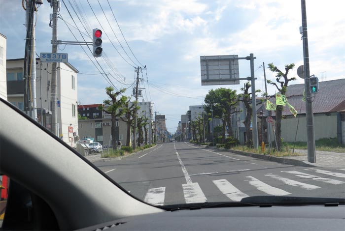 南岸通り、野付牛自動車学校前、奥がとん田通りの交差点