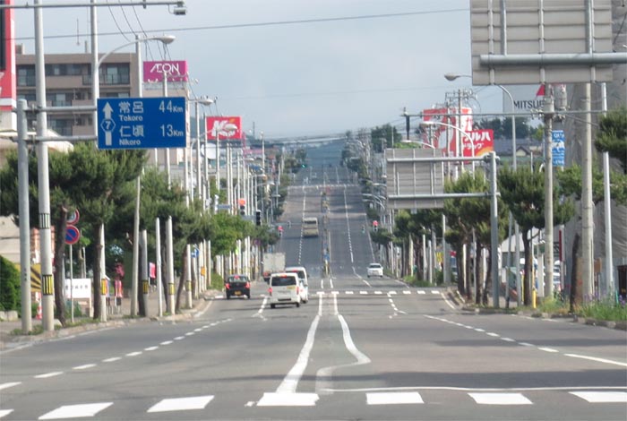 末広町の南岸通り、西4号線バス停前から野付牛自動車学校方向