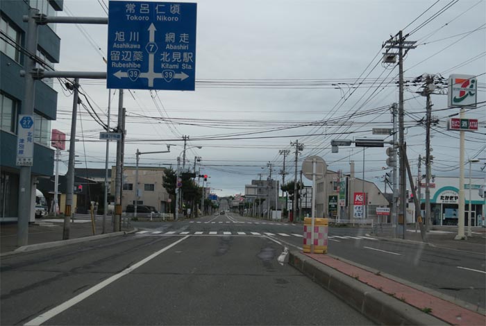南岸通り、野付牛自動車学校前、奥がとん田通りの交差点