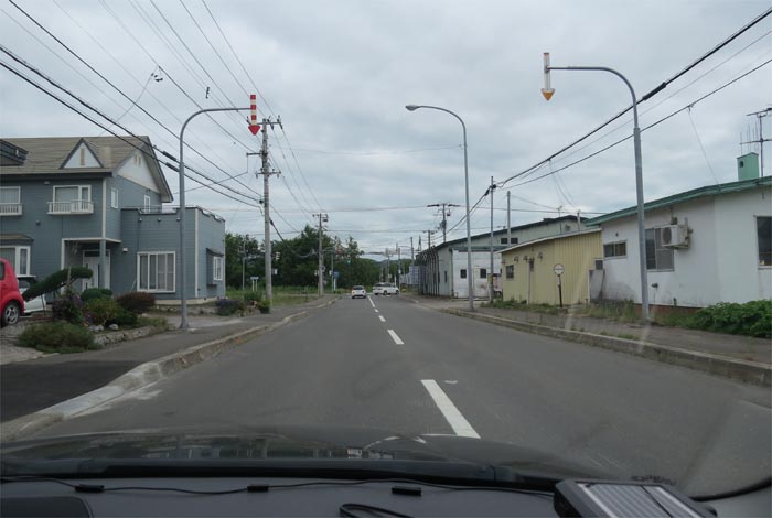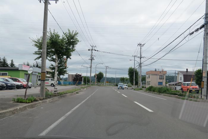 南岸通り、野付牛自動車学校前、奥がとん田通りの交差点