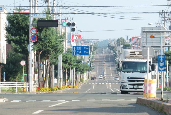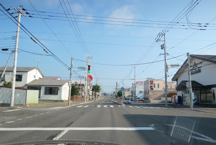 南岸通り、野付牛自動車学校前、奥がとん田通りの交差点