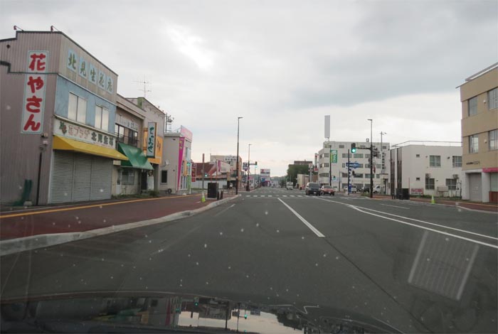 南岸通り、野付牛自動車学校前、奥がとん田通りの交差点