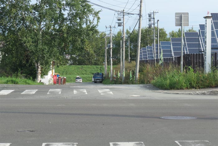 交差点から奥が無加川の右岸堤防で写真奥が国道39号方向