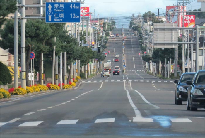 末広町の南岸通り、西4号線バス停前から野付牛自動車学校方向