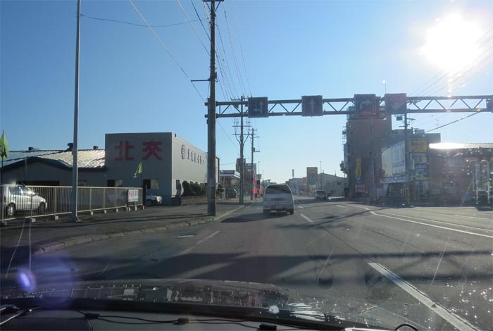 南岸通り、野付牛自動車学校前、奥がとん田通りの交差点