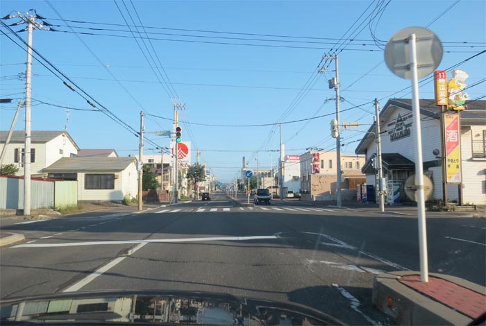 南岸通り、野付牛自動車学校前、奥がとん田通りの交差点