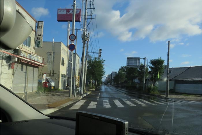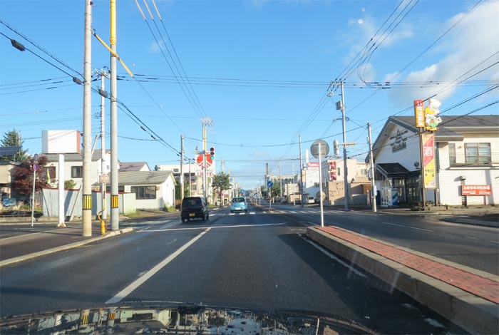 南岸通り、野付牛自動車学校前、奥がとん田通りの交差点