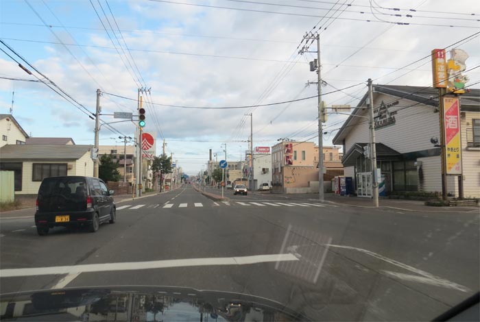 南岸通り、野付牛自動車学校前、奥がとん田通りの交差点