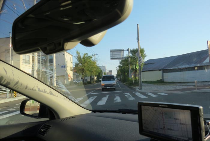 南岸通り、野付牛自動車学校前、奥がとん田通りの交差点