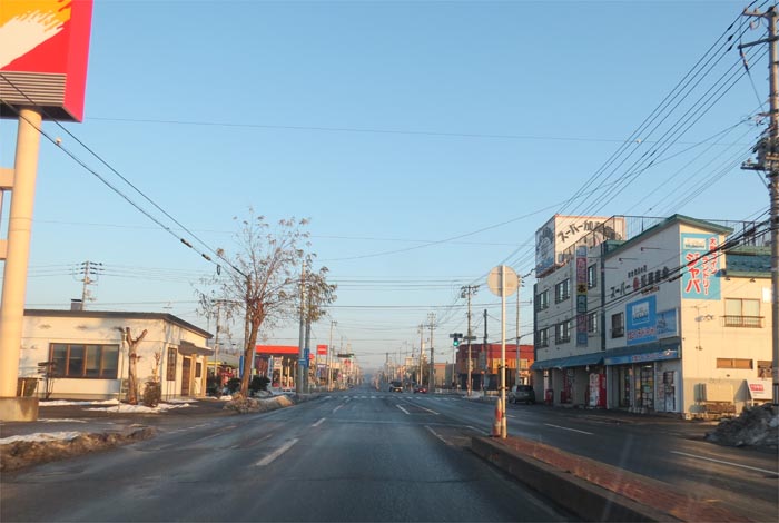 南岸通り、野付牛自動車学校前、奥がとん田通りの交差点