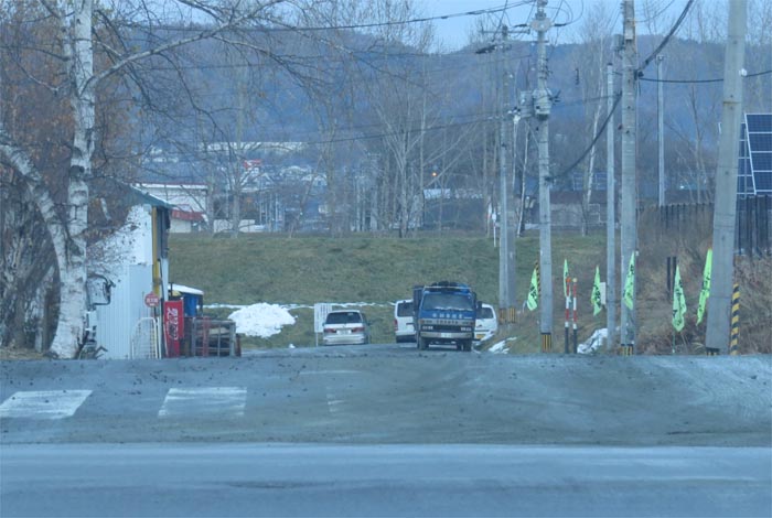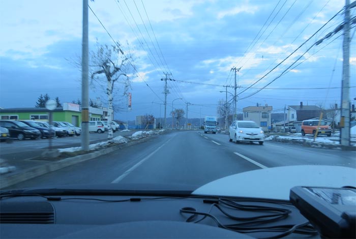 南岸通り、野付牛自動車学校前、奥がとん田通りの交差点