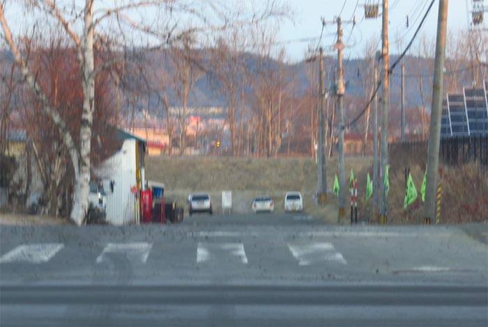 南岸通り、野付牛自動車学校前、奥がとん田通りの交差点