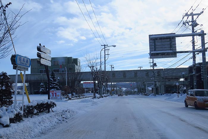 前方がJR石北本線高架橋、写真右が北見駅方向