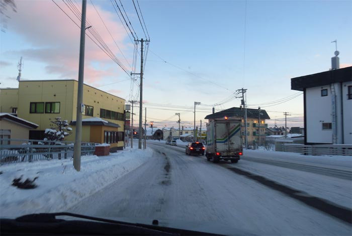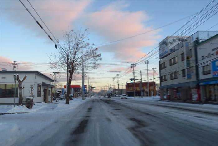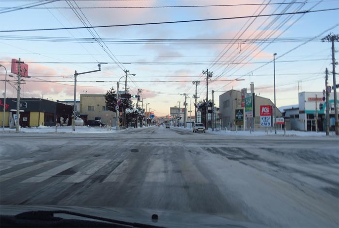 南岸通り、野付牛自動車学校前、奥がとん田通りの交差点