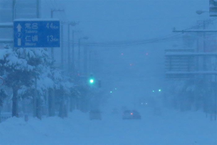 南岸通り、野付牛自動車学校前、奥がとん田通りの交差点