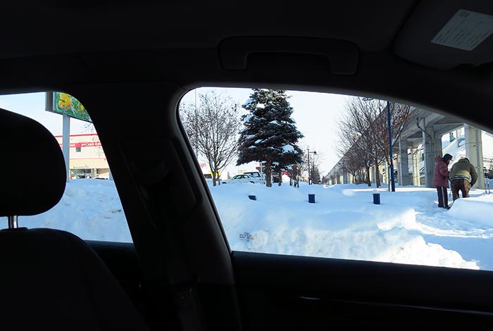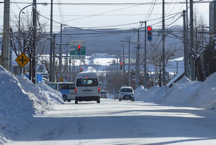 前方がJR石北本線高架橋、写真右が北見駅方向