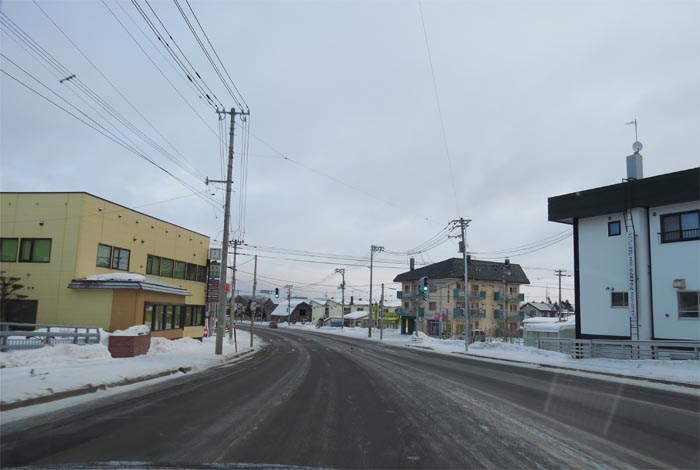 南岸通り、野付牛自動車学校前、奥がとん田通りの交差点