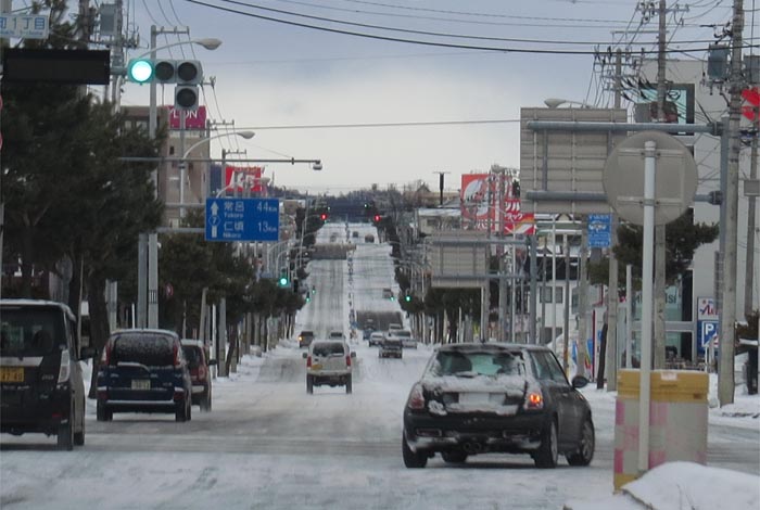南岸通り、野付牛自動車学校前、奥がとん田通りの交差点