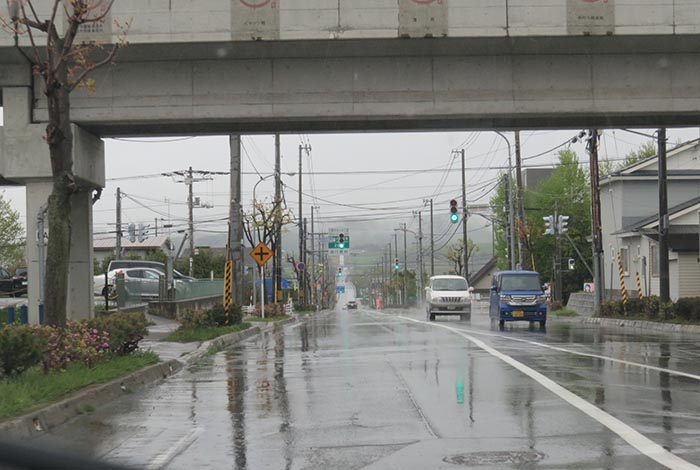 前方がJR石北本線高架橋、写真右が北見駅方向