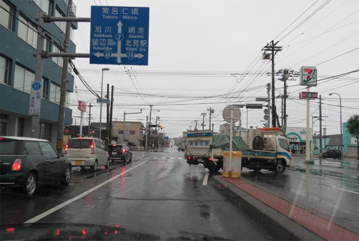 南岸通り、野付牛自動車学校前、奥がとん田通りの交差点