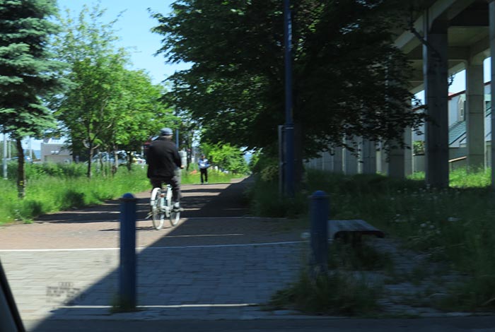 前方がJR石北本線高架橋、写真右が北見駅方向