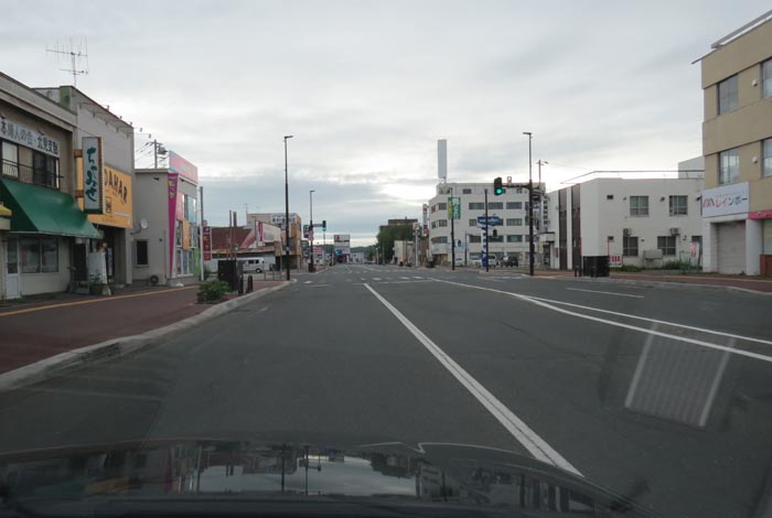 南岸通り、野付牛自動車学校前、奥がとん田通りの交差点