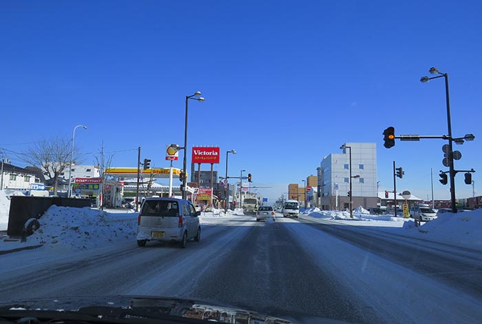 午前9時20分、国道39号の五差路から左は石北峠・旭川・札幌方面