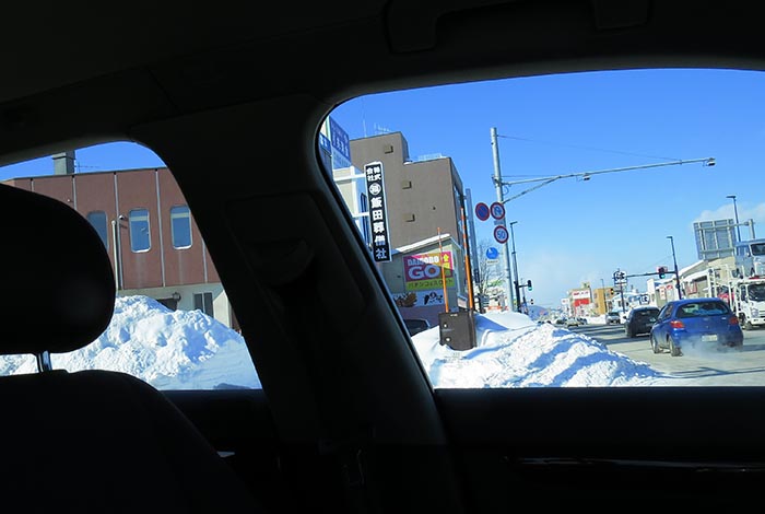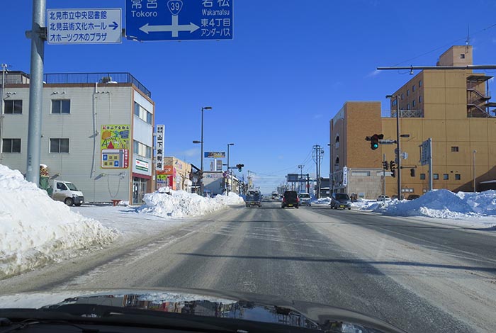 午前9時20分、国道39号の五差路から左は石北峠・旭川・札幌方面