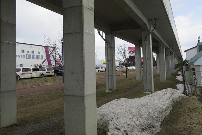 前方がJR石北本線高架橋、写真右が北見駅方向